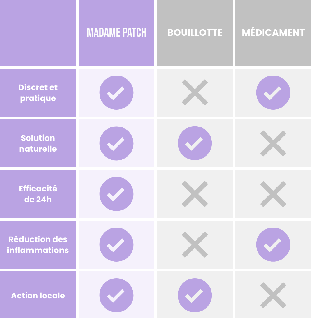 Unlike hot water bottles, which are not always practical at work, or medications that can cause side effects, our CBD patches work in a targeted, discreet and prolonged manner.