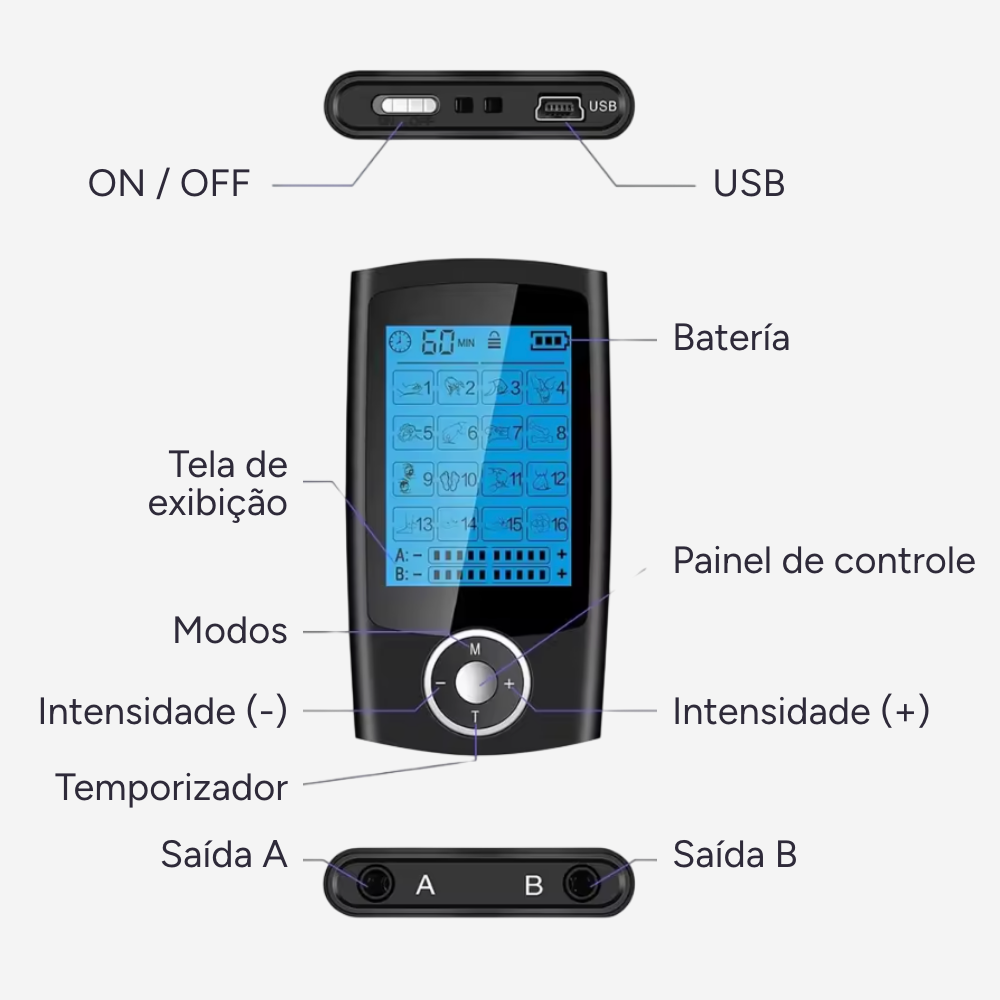 Este tipo de dispositivo utiliza uma base técnica padronizada, historicamente projetada para diversos usos de estimulação muscular e massagem.